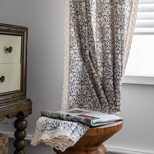 Vintage Blue and White Ceramic Print Cotton Linen Drapes